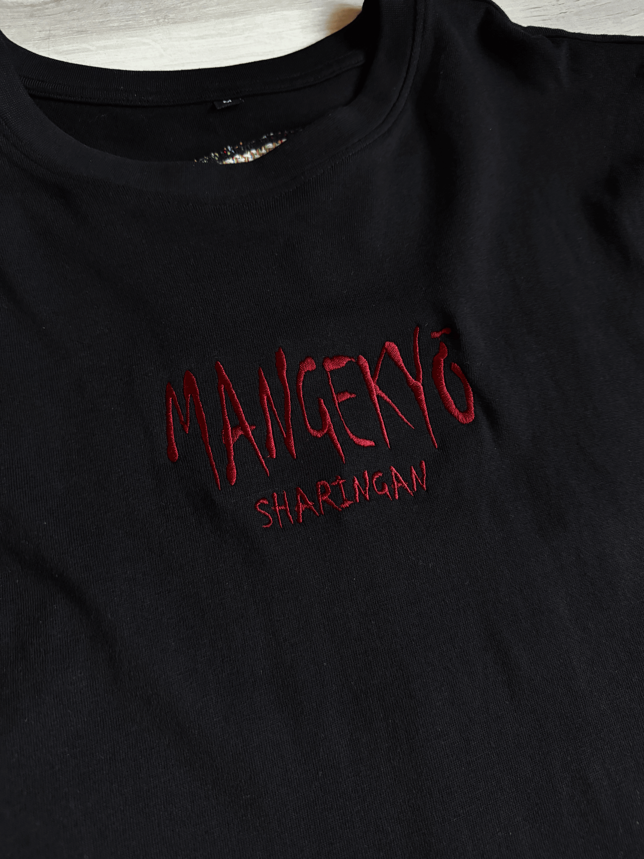 Przód koszulki – Na froncie znajduje się haftowany napis „Mangekyō Sharingan” wykonany czerwonymi nićmi. Charakterystyczny, lekko surowy styl liter nawiązuje do mrocznej historii klanu Uchiha oraz do jednej z najpotężniejszych form Sharingana. Minimalistyczny detal sprawia, że koszulka pozostaje subtelna, ale jednocześnie natychmiast rozpoznawalna dla fanów serii.