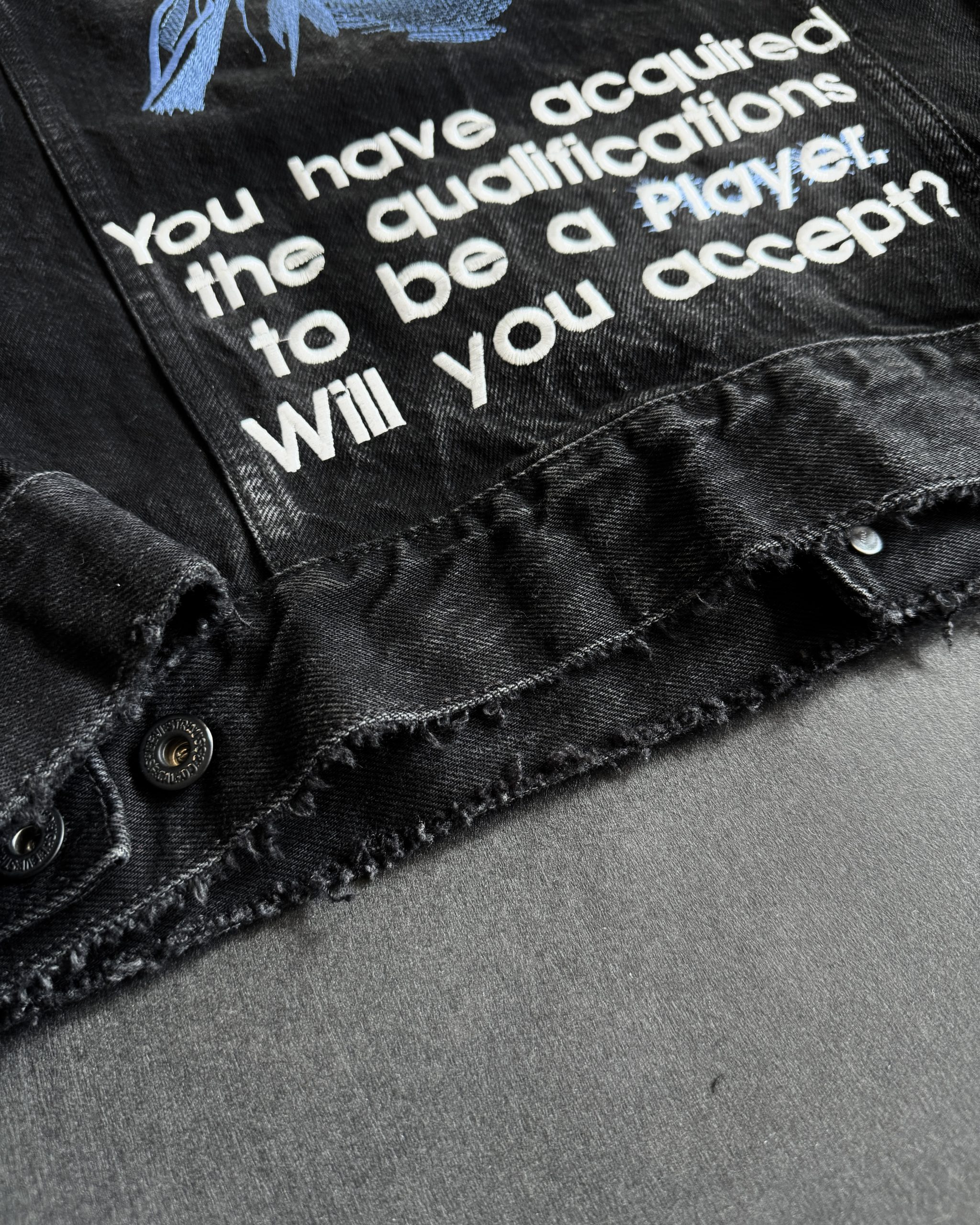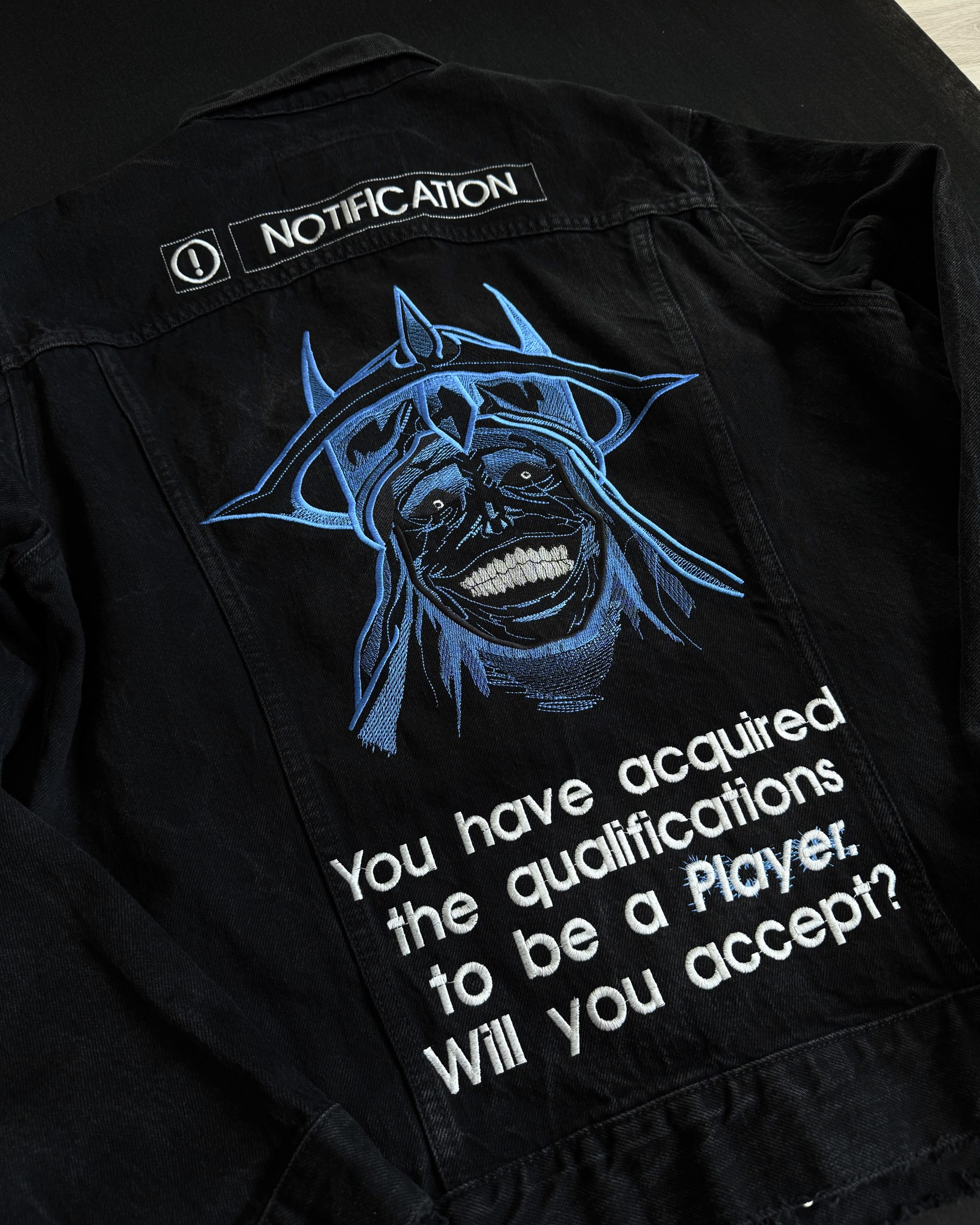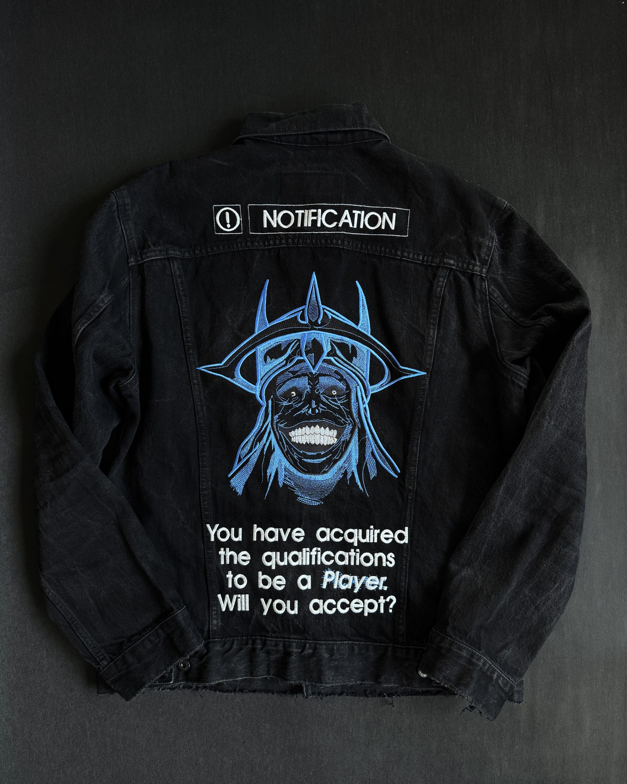 Tył kurtki to prawdziwa gratka dla fanów – z wyhaftowany ikonicznym wizerunkiem Statue of God w odcieniach niebieskiego, oddający jego mroczną aurę. Powyżej widnieje wyraźny napis „NOTIFICATION”, stylizowany na dobrze znany interfejs gracza. Całość dopełnia kultowy cytat: